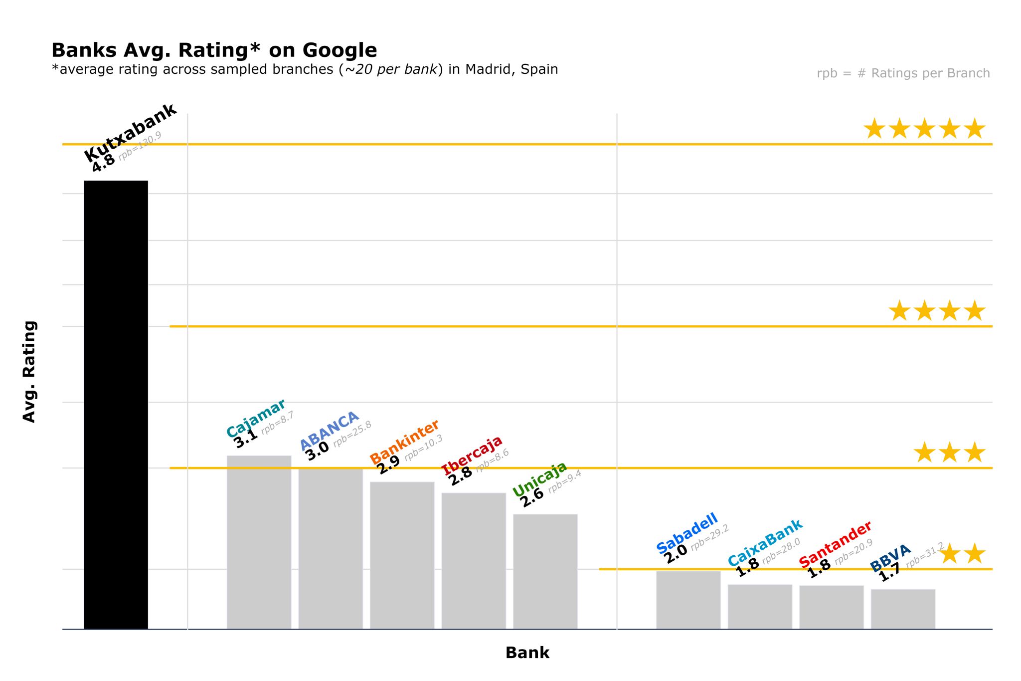 It was enough motivation to bring in some more data for a few more branches (here in Madrid) and all the major banks in Spain: I gathered roughly 20 branches per bank and I added up all the ratings.